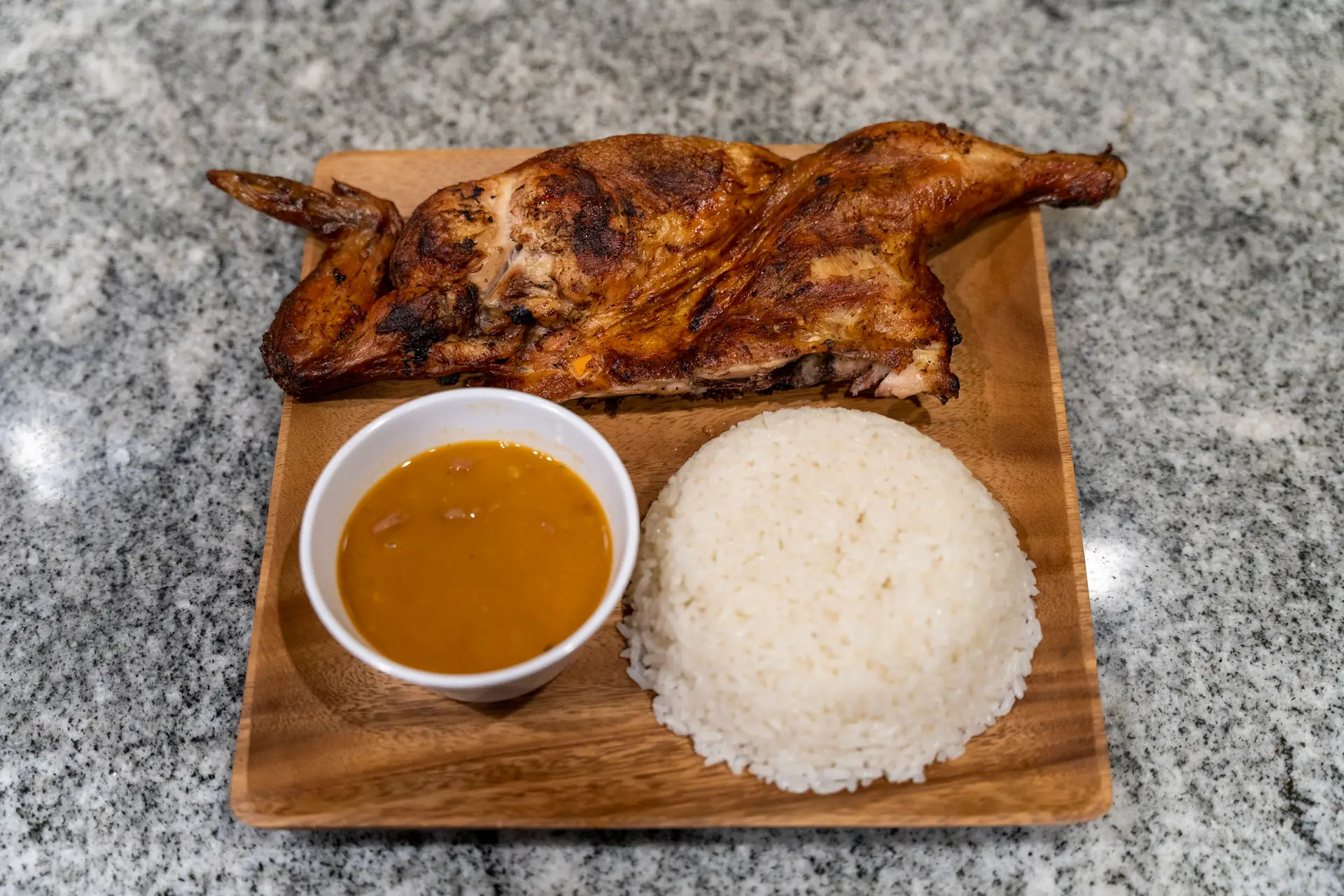 A half chicken with two sides and a house-made sauce — perfect for lunch or dinner.