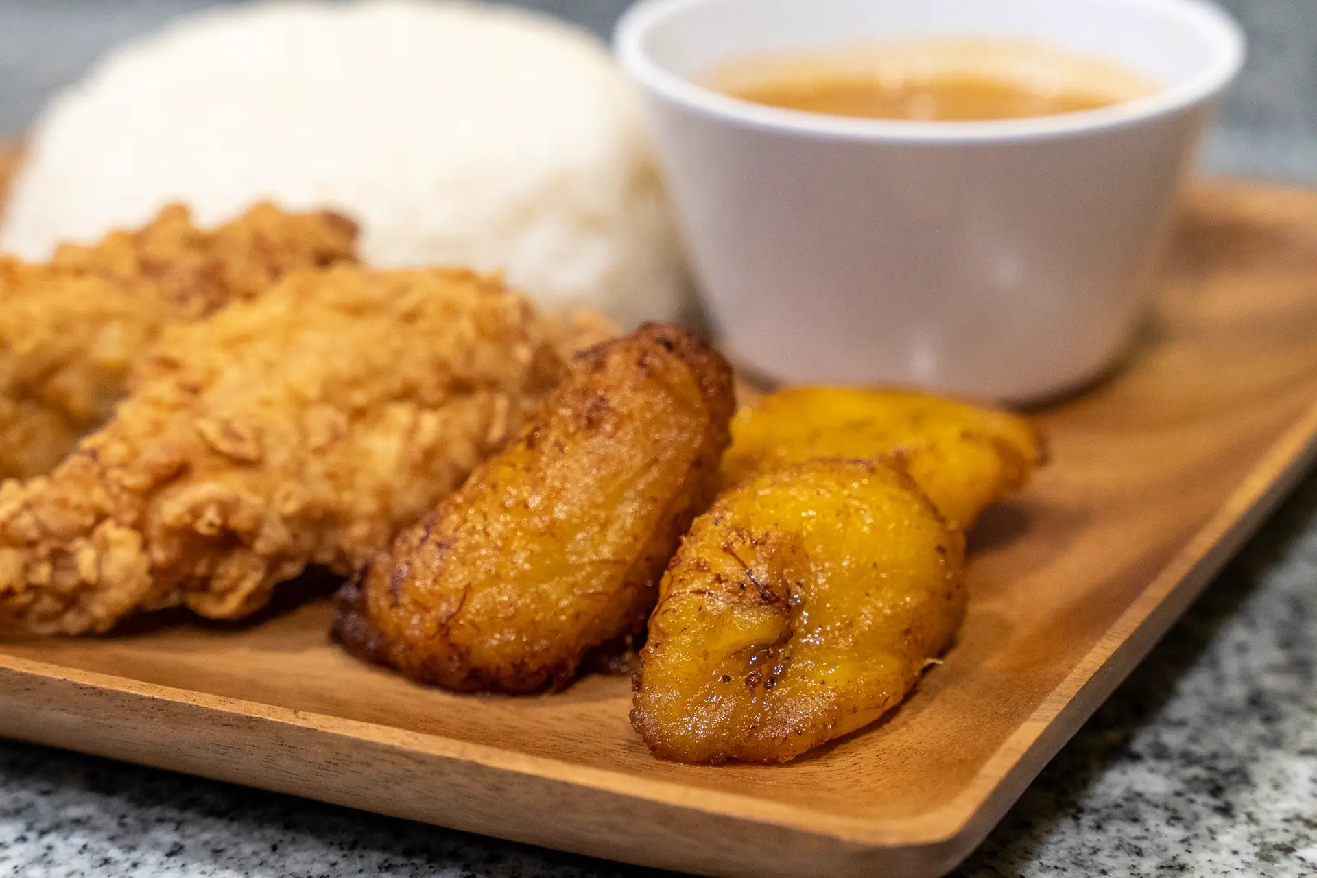 Mashed green plantains mixed with garlic and pork rinds, topped with grilled chicken and savory sauce.